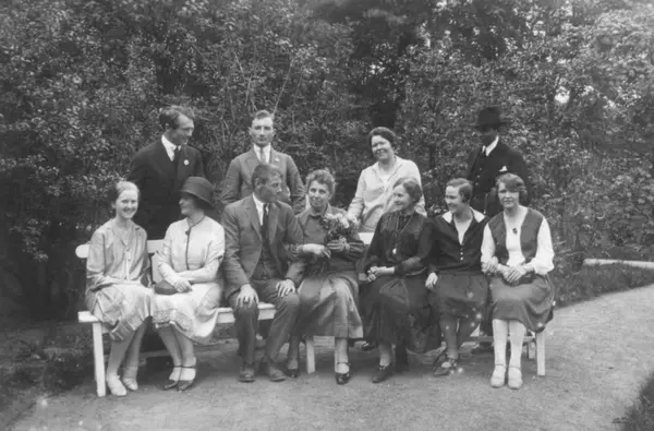 Ansatte på Norsk Folkemuseum samlet i hagen til Leikanger prestegård. Konservator Henrik Grevenor, Konservator Gisle Midttun, Amanuensis Dorothea Stoud Platou, Amanuensis Hilmar Stigum, Amanuensis Halvor Vreim, Voluntør Karin Melby, Museumsassistent Lina Lindholm, Fotograf Jenny Arnesen, Assistent Aagot Mathisen, Kasserer Ruth Midttun
