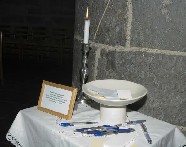 Gamle Aker kirke. Allehelgensdag 4. november 2007. Bord med ark, penner, et tent lys og et lite skilt. Fat med bønnekort hvor menigheten har skrevet navn på noen de har mistet. Fatet med lapper blir båret til alteret under gudstjenesten.