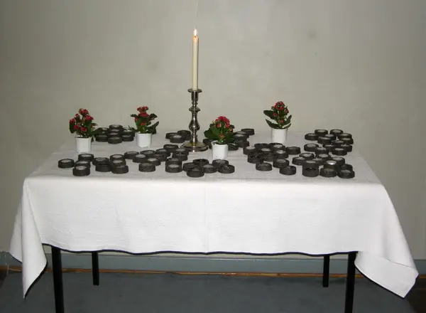 Allehelgensdag i Tonsen kirke, Oslo, 04.11.2007. Lystenningsbord bakerst i kirken. Telys, blomster og lysestake med tent lys.