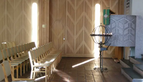 Allehelgensdag i Tonsen kirke, Oslo, 04.11.2007. Fra kirkerommet etter gudstjenesten. Prekestol med grønt klede med brød og kors som symboler. Lysglobe med tente lys. Stoler.