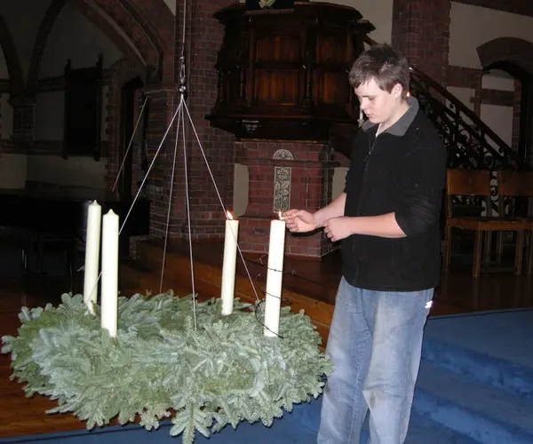 Paulus kirke i Oslo, 2. søndag i advent, 09.12.2007. En konfirmant tenner to lys i lyskransen som er senket ned fra taket foran alteret. Ett av lysene er viklet i piggtråd. Det tennes første gang på menneskerettighetssøndagen.