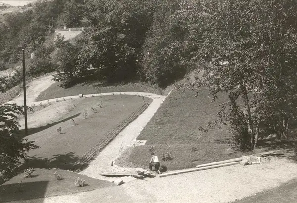 Mann planter blomster i parken til A/S Joh. Petersens Linvarefabrik.