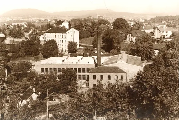 Fabrikkbygninger til A/S Joh. Petersens Linvarefabrik med boliger i bakgrunnen.