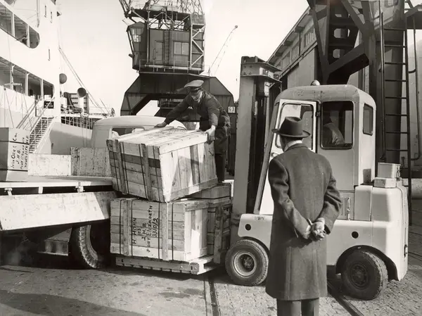 Lastebil fra A/S Joh. Petersens Linvarefabrik og truck laster kasser på brygga ved skip.