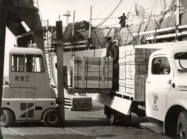 Lastebil fra A/S Joh. Petersens Linvarefabrik og truck laster kasser på brygga ved skip.