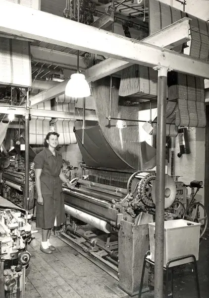 Produksjonslokale ved A/S Joh. Petersens Linvarefabrik. Arbeiderske ved vevstol.