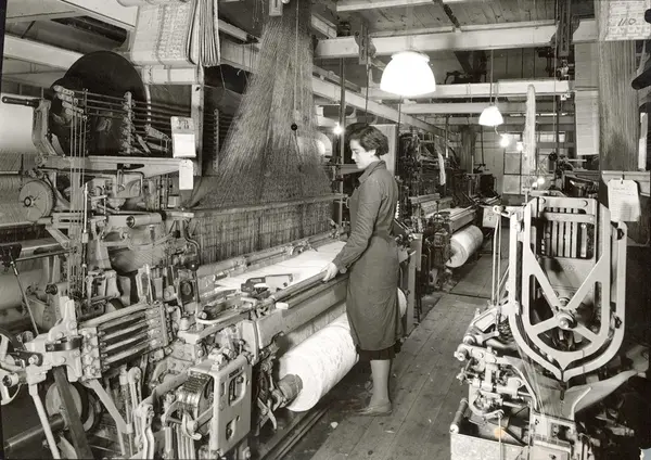 Produksjonslokale ved A/S Joh. Petersens Linvarefabrik. Arbeiderske ved vevstol.