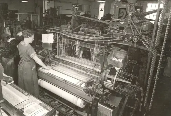 Produksjonslokale ved A/S Joh. Petersens Linvarefabrik. Arbeiderske ved vevstol.