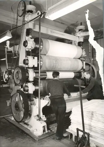 Produksjon ved A/S Joh. Petersens Linvarefabrik. Tekstil går gjennom maskin med store valser som betjenes av to menn.