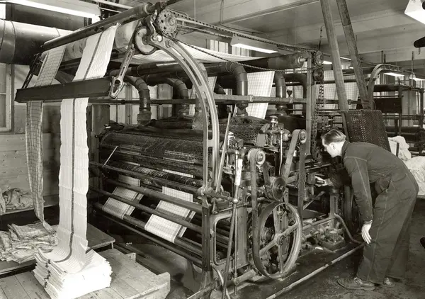 Produksjon ved A/S Joh. Petersens Linvarefabrik. Yngvar Olsen ved skjæremaskin..