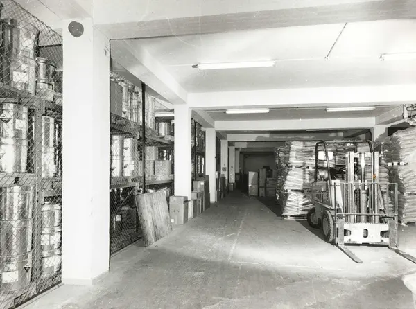 Fotografiene kom inn til museet med annet gjenstandsmateriale fra Fortex fabrikken, ved dennes nedleggelse i 1976. Christiania Seilduksfabrik, grunnlagt 1856, fusjonerte i 1960 med A/S Joh. Petersen Linvarefabrik, grunnlagt 1854, til Fortex A/S. Norges siste damaskveveri. Bilder tatt forbindelse med nedleggelsen av Fortex A/S i 1976. Notert på bildet: Nybygget ferdig 1971. En mann hadde ansvaret, "garnmannen". Garn ble kjøpt fra Borregaard og Solberg. Ullgarn fra Belgia, Frankrike etc.