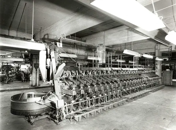 Fotografiene kom inn til museet med annet gjenstandsmateriale fra Fortex fabrikken, ved dennes nedleggelse i 1976. Christiania Seilduksfabrik, grunnlagt 1856, fusjonerte i 1960 med A/S Joh. Petersen Linvarefabrik, grunnlagt 1854, til Fortex A/S. Norges siste damaskveveri. Bilder tatt forbindelse med nedleggelsen av Fortex A/S i 1976. Notert på bildet: Spolemaskin. I veveriet sto i -76 to spolemaskiner, som ble flyttet opp fra forberedelsesavdelingen. Opprinnelig stod det der tre spolemaskiner med 36 spindere hver, betjent av to kvinner. Fra spolemaskinen falt garnet ned i kasser som ble overført derfra til spolesentralen.