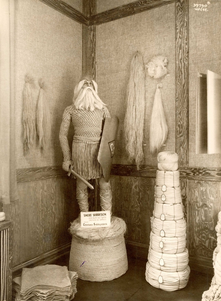 Fortex A/S. Viking utstillingsdukke (Snore Surreson) og tekstilprøver fra Seilduksfrabrikken.