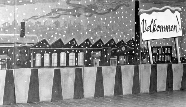 Christiania Seilduksfabriks jubileumsdekorasjoner med velkommenskildt.