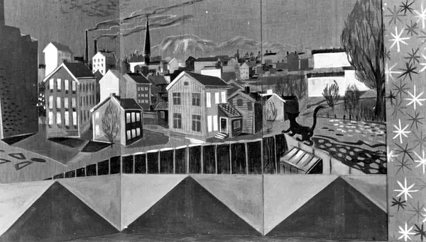 Christiania Seildugsfabriks jubileumsdekorasjoner med bymotiv.