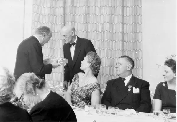 Christiania Seildugsfabriks jubileumsmiddag. Økonom Ivar Borgersen overrekker gave.