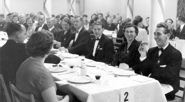 Christiania Seildugsfabriks jubileumsmiddag. Sangkoret og teatergruppa sitter ved sitt bord.