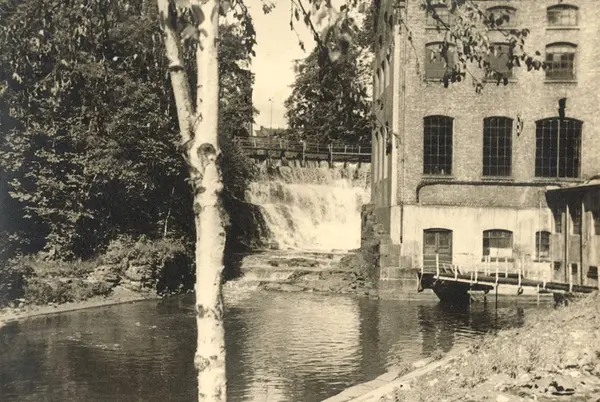 Album fra Christiania Seildugsfabrik. Fabrikkbygning, Akerselva og fossen.