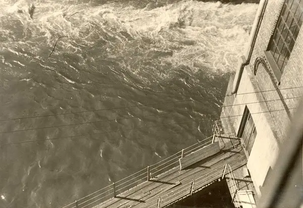 Album fra Christiania Seildugsfabrik. Fabrikkbygning, gangbru og elva sett ovenifra.