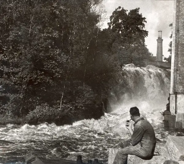 Album fra Christiania Seildugsfabrik. Fabrikkbygning, Akerselva og fossen. Mann med pipe.