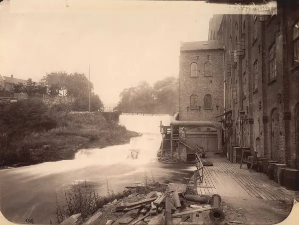 Fortex A/S. Christiania Seildugsfabrik. Fabrikkbygninger, elv med foss og demning. Oslo, 1898.
