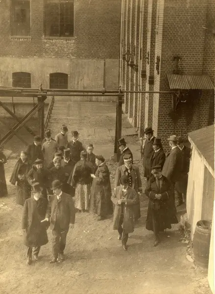 Fortex A/S. Menn i gårdsrom mellom fabrikkbygninger.