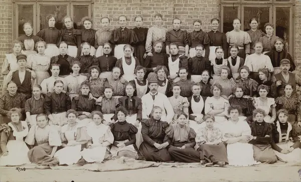 Personalalbum fra Christiania Seildugsfabrik, påbegynt i 1956. Veverimester Knudsen med en gruppe kvinner fra veveriet på gårdsplassen i 1878.