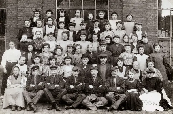 Personalalbum fra Christiania Seildugsfabrik, påbegynt i 1956. En gruppe tvinneriarbeidere med sin formann Olaves Olsen i 1907.
