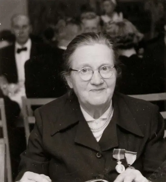 Personalalbum fra Christiania Seildugsfabrik, påbegynt i 1956. Portrett av Marie Fjeld, jutespinneriet. Født 11.08.1884. Ansatt 1905. Pensj. 1955.