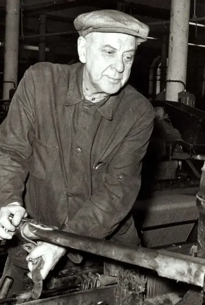 Personalalbum fra Christiania Seildugsfabrik, påbegynt i 1956. Portrett av stolstiller Sigurd Nilsen. Født 25.02.1887. Ansatt 20.11.1902. Pensj. 02.03.1957. 54 års tjeneste 20.11.1956.