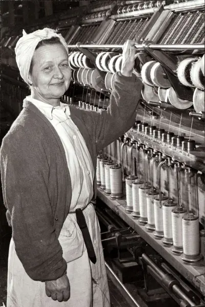 Personalalbum fra Christiania Seildugsfabrik, påbegynt i 1956. Portrett av Olga Hoel ved gillspinner. Født 18.09.1902. Ansatt 15.04.1925. 32 års tjeneste 1957. Økonom fra 1940.