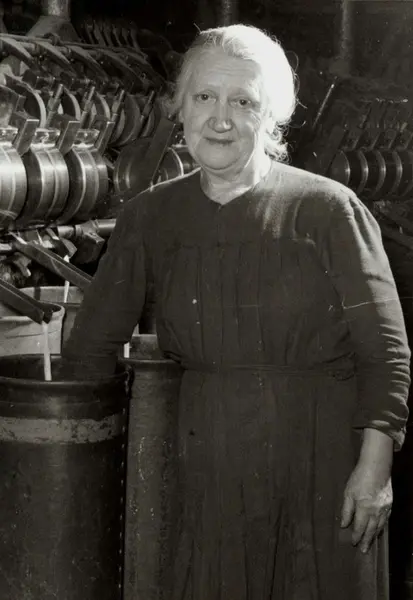 Personalalbum fra Christiania Seildugsfabrik, påbegynt i 1956. Portrett av Thora Nilsen ved en hamptrekke. Født 10.01.1893. Ansatt 17.10.1910. 32 års tjeneste i 1957.