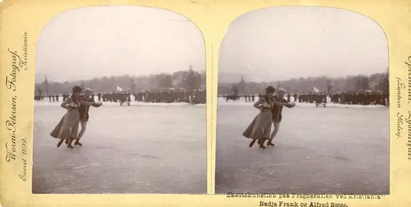 Stereoskopi. Parløp på skøyter på Frognerkilen, Oslo. Antatt 1899.