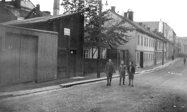 Bebyggelse og gatemiljø i Oslo, antakelig på 1950-tallet. Gutter i gata.