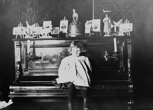 Gudrun Q. Wiborg sitter på pianolokk i Meltzers gate 9, Oslo, 1899. Fotografier i ramme plassert på pianoet.