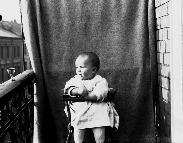 Lillebror Axel Q. Wiborg i barnestol fotografert på balkong, ant. Meltzers gate 9, Oslo, oktober 1899, mot opphengt bakteppe.