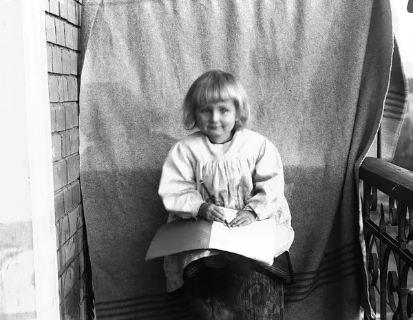 Gudrun Q. Wiborg fotografert på balkong, Oslo, 1899, mot opphengt bakteppe.