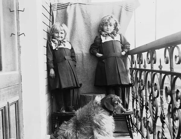 Karen og Gudrun Q. Wiborg med hund fotografert på balkong, antatt Meltzers gate 9, Oslo, 1899, mot opphengt bakteppe.