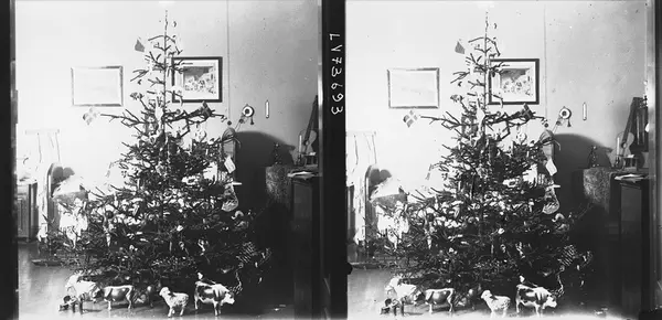 Julefeiring, interiør hos familien Q. Wiborg med juletre, lekedyr rundt, Munkedamsveien 3, Oslo, 1901.