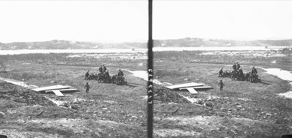 Fyllingen (?) med Oscarshall, Bygdøy, Oslo, i bakgrunnen, 1899. Gruppe i åpent landskap.