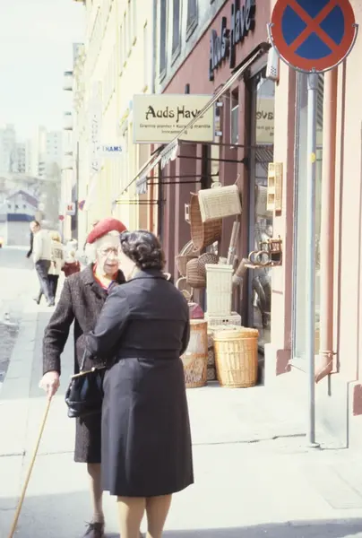 To eldre damer i prat foran butikk som selger kurver. Bildet er antagelig tatt i forbindelse med en artikkel om byfornyelse på Grünerløkka i Oslo. Fotografert for Bonytt 1982.