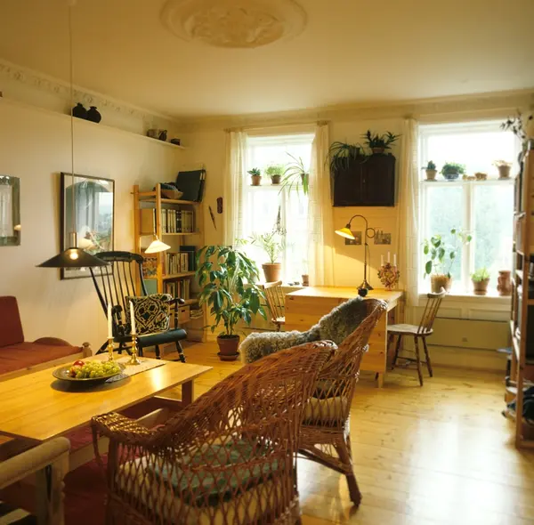 Stue i nyoppusset leilighet i gammel bygård på Grünerløkka i Oslo. Leiligheten er pusset opp av keramikkstudent Kirsti Sundstrøm. Illustrasjonsbilde for Bonytt 1983.