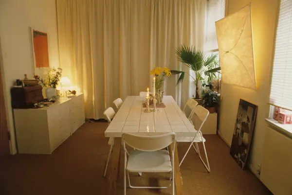 Spisebord av flisebelagt dørblad. Leilighet i gammel bygård på Bislett i Oslo, innredet av grafisk designer Enzo Finger. Fotografert for Bonytt 1983.