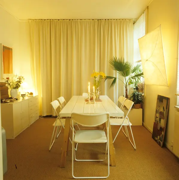 Spisebord av flisebelagt dørblad. Leilighet i gammel bygård på Bislet i Oslo, innredet av grafisk designer Enzo Finger. Illustrasjonsbilde for Bonytt 1983.