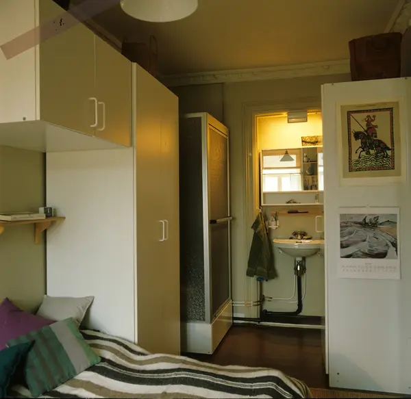 Soverom med vask og dusj i nyoppusset leilighet i gammel bygård på Grünerløkka i Oslo. Fotografert for Bonytt 1983.