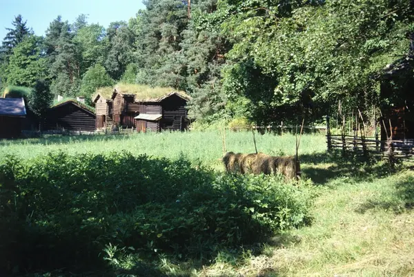 Motiv fra Norsk Folkemuseum på Bygdøy, Oslo. Østerdalstunet sett fra Ampiansbråten. Ant. fotografert 1983.