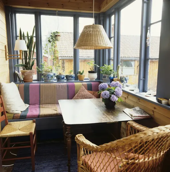 Glassveranda med bord, stoler og potteplanter i enebolig, Nordstrand, Oslo. Illustrasjonsbilde fra Bonytt 1983.
