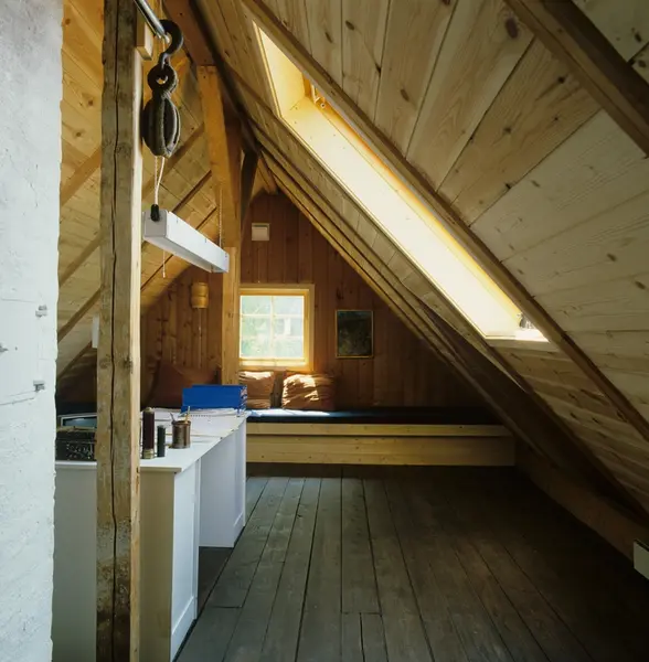 Del av loft med sittebenk i enebolig, Nordstrand, Oslo. Illustrasjonsbilde fra Bonytt 1983.
