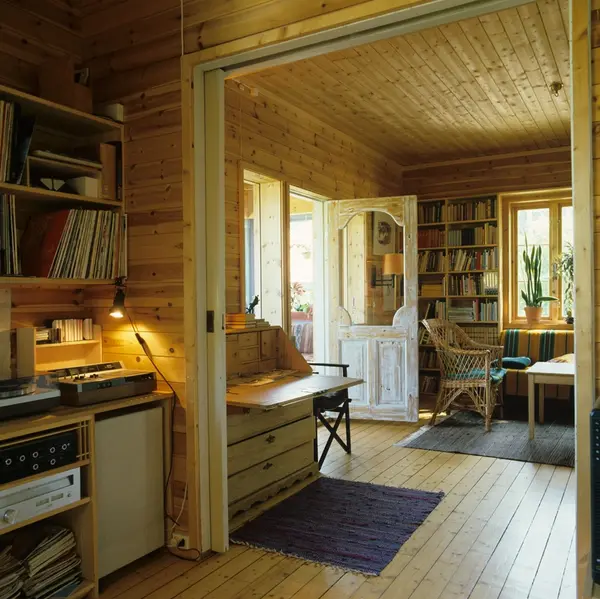 Stue med dør ut til glassveranda i enebolig, Nordstrand, Oslo. Illustrasjonsbilde fra Bonytt 1983.
