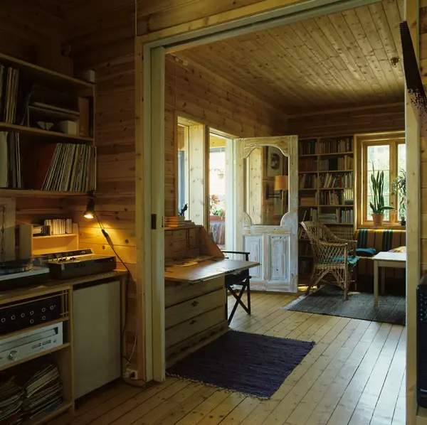 Stue med dør ut til glassveranda i enebolig, Nordstrand, Oslo. Illustrasjonsbilde fra Bonytt 1983.